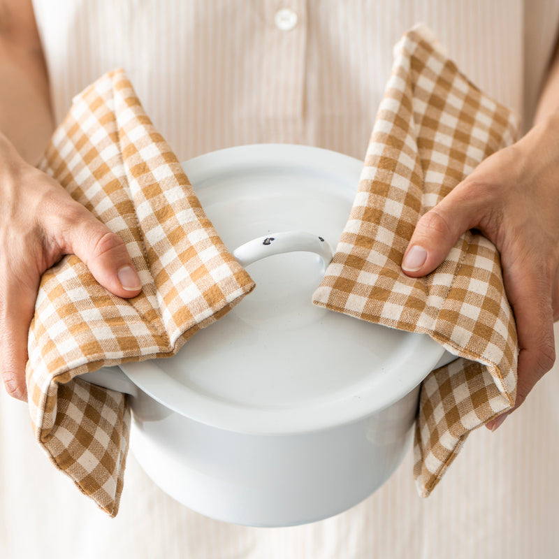 Camel and white gingham potholder in quilted cotton. It effectively protects from heat while brightening up the kitchen with its fresh and timeless pattern. Practical for everyday use, easy to hang.