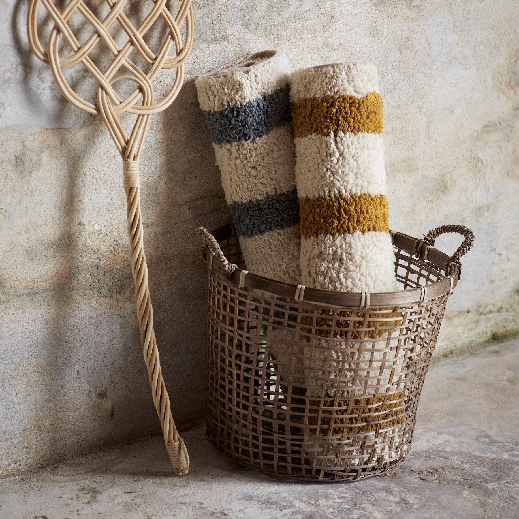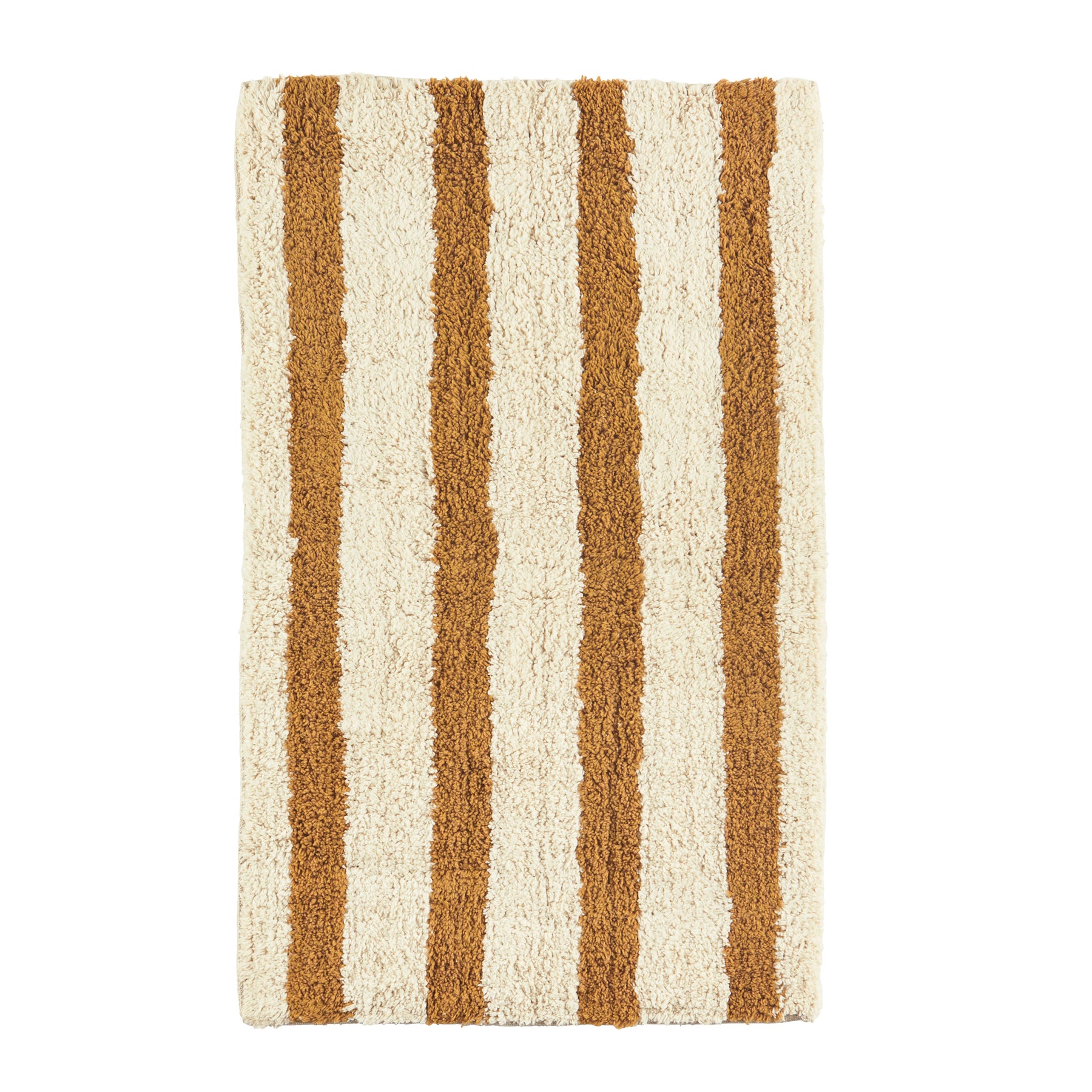 Apportez une touche bohème et raffinée à votre salle de bain avec ce tapis de bain Madam Stoltz à rayures camel et blanc.