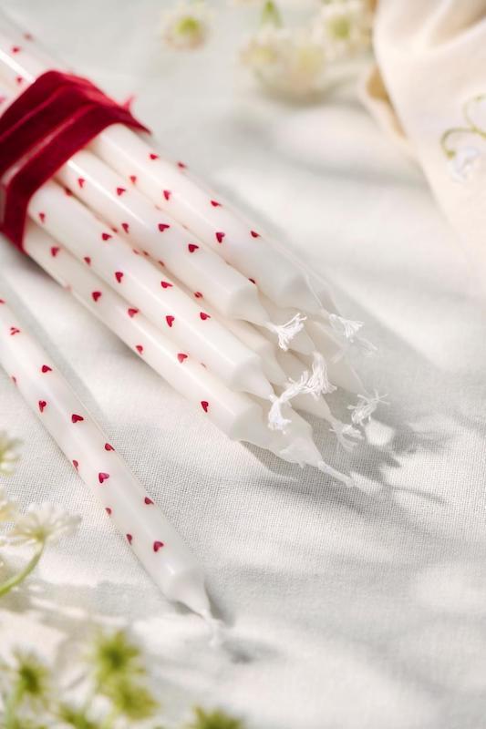 Bougie avec coeurs rouges.