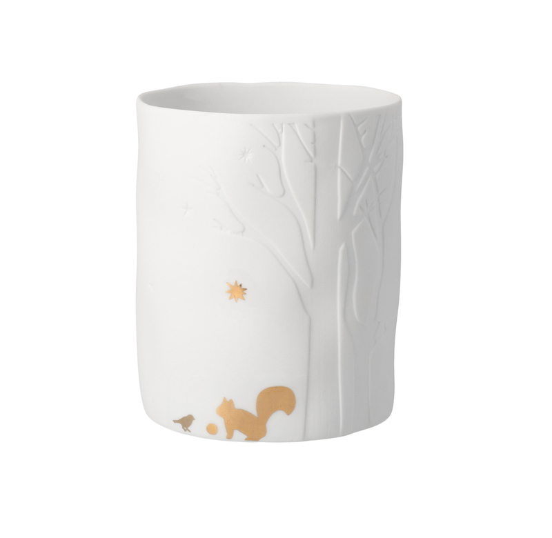 Créez une atmosphère chaleureuse et poétique avec ce superbe photophore en porcelaine blanche Rader, représentant un écureuil et un oiseau dorés dans la forêt.