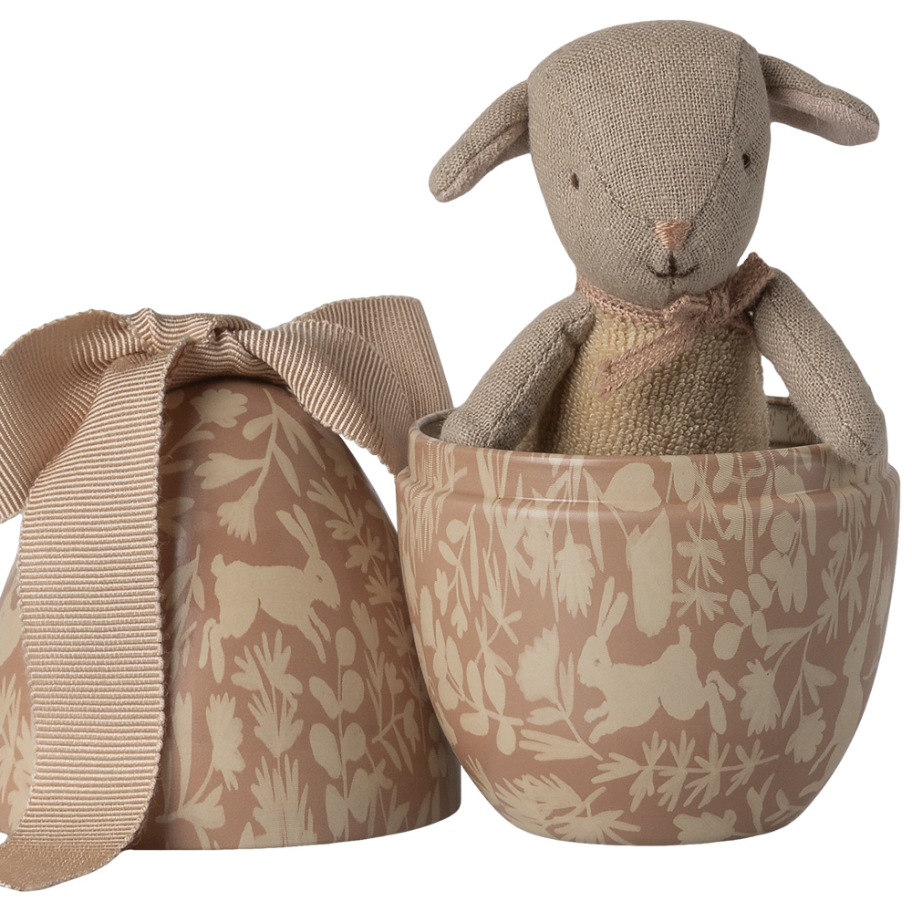 À l’intérieur de cet œuf en métal, décoré d’un joli imprimé et surmonté d’un grand nœud doux, se cache un petit agneau en peluche habillé d’une combinaison rose blush. Un cadeau parfait pour les tout-petits, idéal pour une décoration de Pâques pleine de douceur. Ce charmant agneau Maileg possède des aimants dans les mains, ce qui lui permet de s’accrocher autour de l’œuf et de compléter joliment votre décoration de Pâques Maileg.