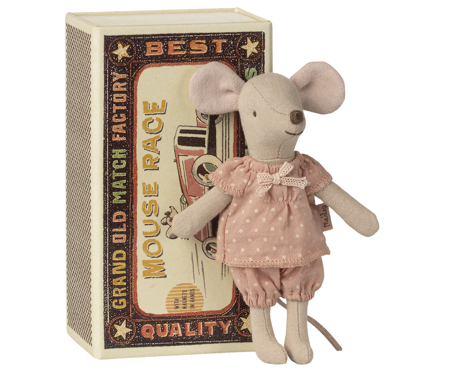 C'est le grand classique de la marque danoise Maileg — et peut-être son objet le plus magique. Cette souris grande sœur de 13 cm, habillée d'une tenue aux tissus doux et aux motifs uniques, a élu domicile dans sa boîte d'allumettes joliment décorée, garnie de son matelas, son oreiller et sa couverture. Ses petites mains aimantées lui permettent de tenir ses accessoires — et de s'accrocher à ceux qu'elle aime.